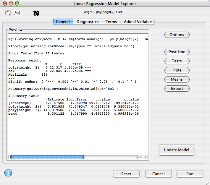 Additionally, several plots can be accessed through the upper tabs to help diagnose the fit of the model.